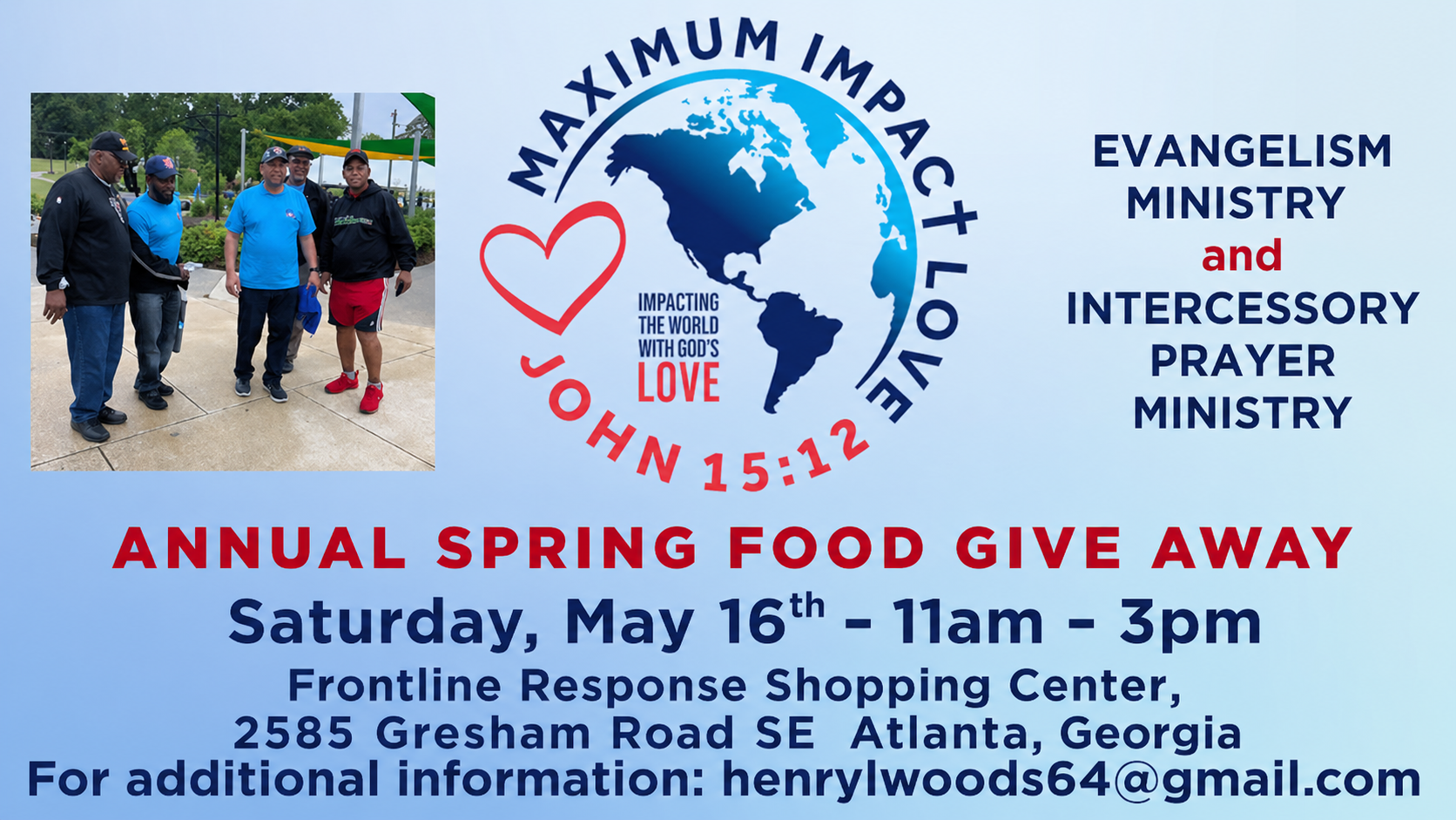 The Evangelism Ministry and the Intercessory Prayer Ministry will be joining ranks again with Maximum Impact Love in their Annual Spring Food Give Away on Saturday, May 16th, from 11am – 3pm at Frontline Response Shopping Center, 2585 Gresham Road SE Atlanta, Georgia.