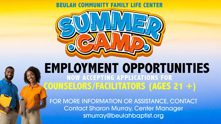 We’re getting ready for Summer Camp 2026! We are excited to prepare for an amazing camp season. Beulah Community Family Life Center is seeking enthusiastic, dependable, and child-focused individuals to join our Summer Camp Team. We are hiring Summer Camp Teachers retired and or currently certified in elementary and middle school and Summer Camp Counselors/Facilitators ages 21 or older with some college experience to support a fun, safe, and engaging camp experience for children 5-12.